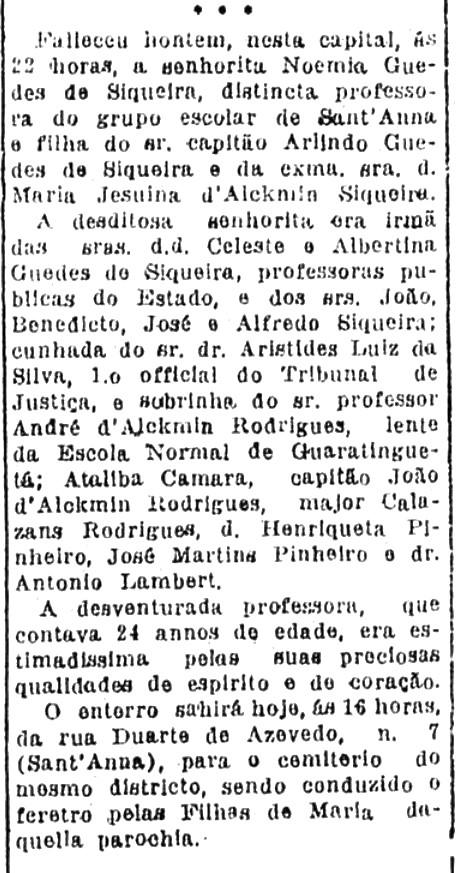 Nascida a 25-10-1865 em Cristina-MG, batizada a 29-12-1865 tendo como padrinhos João José Rodrigues (seu avô materno) e Maria Augusta Cesarino Ribeiro (sua avó paterna) por procuração apresentada por Felicidade Perpetua de Jesus. Falecida a 09-03-1927, sepultada no cemitério de Santana-SP, causa mortis: câncer de fígado, morava na Rua Voluntários da Pátria 439. Casada com Arlindo Guedes de Siqueira, Funcionário da Recebedoria de Rendas da Cidade de São Paulo e Corretor, nascido a 27-04-1865 em Silveiras-SP e falecido a 01-02-1926, filho do Capitão Manoel Guedes de Siqueira e Maria de Siqueira.